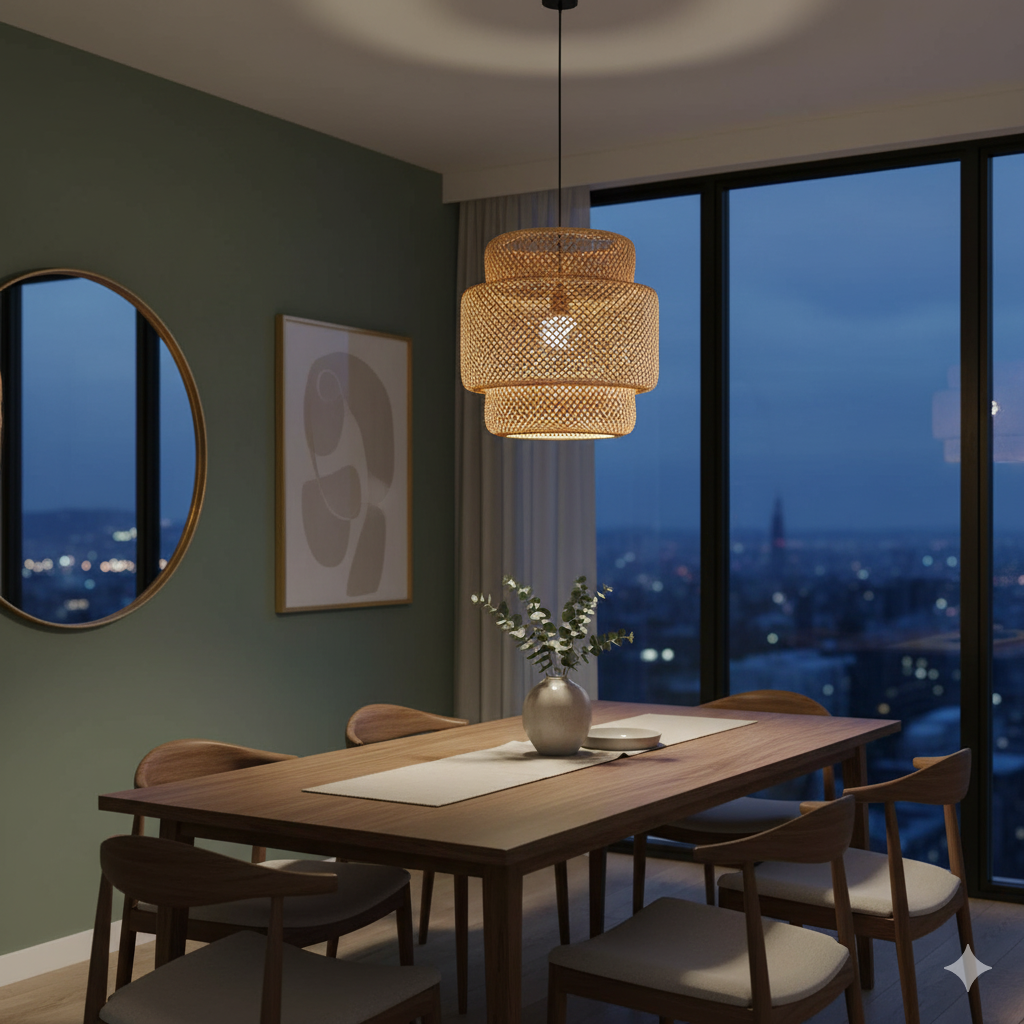 The beige tone complements any décor style — from cozy cafés to minimalist homes — while the handwoven cane pattern diffuses light softly, creating a calm and soothing atmosphere. Perfect for your living room, dining area, bedroom, or creative spaces, this eco-friendly hanging light combines sustainability with timeless style.